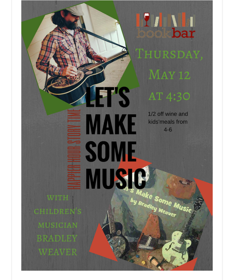 Book Bar's Happier Hour Story Time with Bradley Weaver Tomorrow afternoon at BookBar from 4:00 - 6:00pm! Bring the kids, come say hello and enjoy some live music, great children's stories and 1/2 off wine and kid's meals! Samantha LienMay 11, 2016Comment Facebook0 Twitter LinkedIn0 Reddit Tumblr 0 Likes